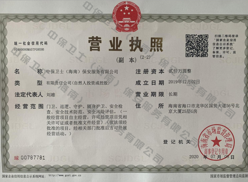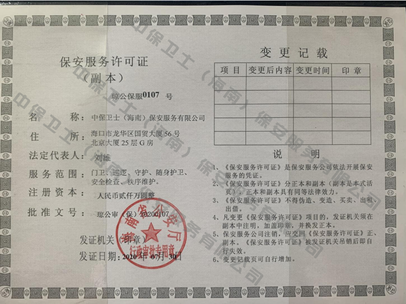 杭州孟豪家庭电子产品有限公司是经海南省公安厅批准,依法持有《保安服务许可证》,提供保安服务、门卫、巡逻、守护、区域秩序维护、随身护卫、安全检查的专业化保安服务公司。